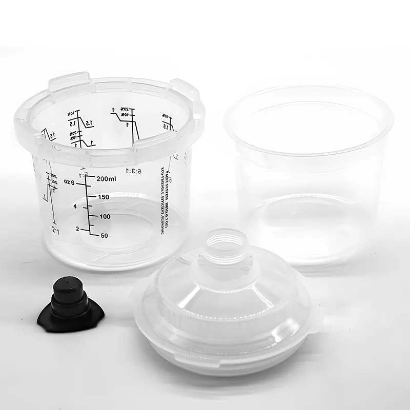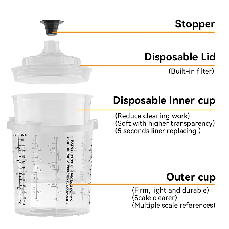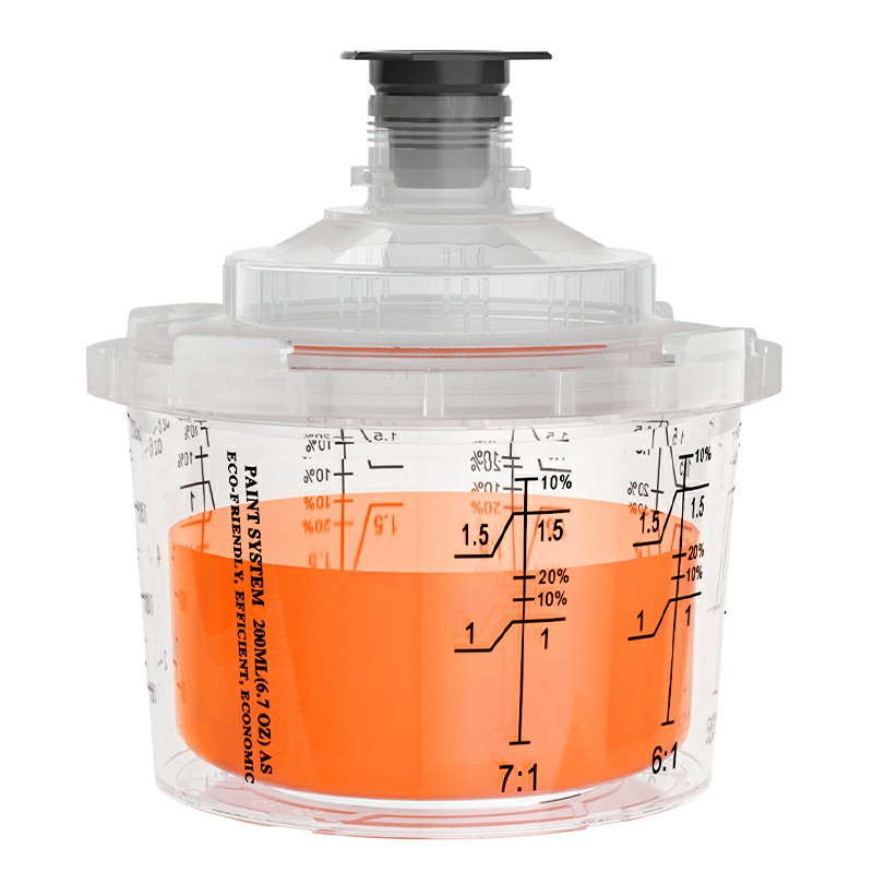 Одноразовая чашка с 200 мл-это одноразовая система чашки для краски, предназначенную для ремонта 1-панели, она подходит для областей, требующих 6,8 FL OZ (200 мл) или меньше материала. Она модернизировала конструкцию внешней чашки на основе серии AYS1.0. Интегрированный замок внешней чашки состоит без частей воротника, которые облегчают сборку и разборку аэрозольной чашки; Система Paint Cup серии Ays3.1 представляет собой новую одноразовую чашку для аэрозольного оружия Ayspat, которая значительно повышает эффективность и качество всего процесса смешивания краски, опрыскивания и хранения.
