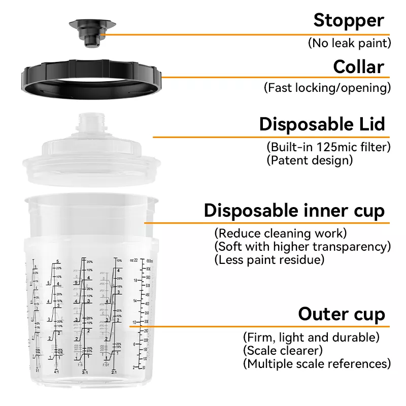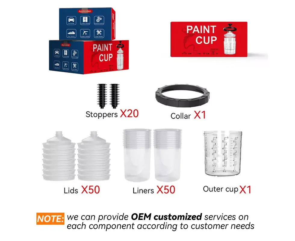 Система одноразовых стаканчиков для краски 2.0 на 650 мл — это инновационное решение, предназначенное для эффективного распыления. Инновационная конструкция ручки крышки стаканчика делает замену вкладыша более удобной, а также повышает прочность крышки, позволяя ей легко сгибаться в нескольких направлениях без поломки. Чтобы удовлетворить потребности клиентов, наша фабрика предлагает индивидуальные решения по производству одноразовых распылителей, включая настройку логотипов и шкал на внешней чашке, настройку цветов и моделей фильтров на крышках, а также предоставление индивидуальных дизайнерских решений для упаковки.