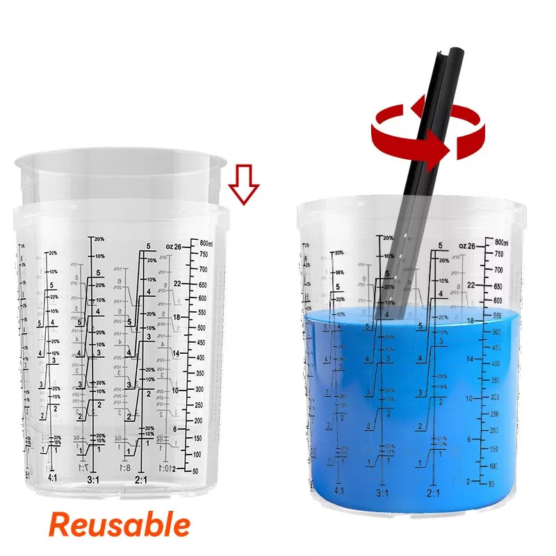 Многоразовая внешняя чашка со шкалой соотношения смешивания. Вставьте одноразовый вкладыш во внешнюю чашку и смешайте краску непосредственно в вкладыше. Сократите затраты на материалы, не используя традиционную чашку для смешивания.
