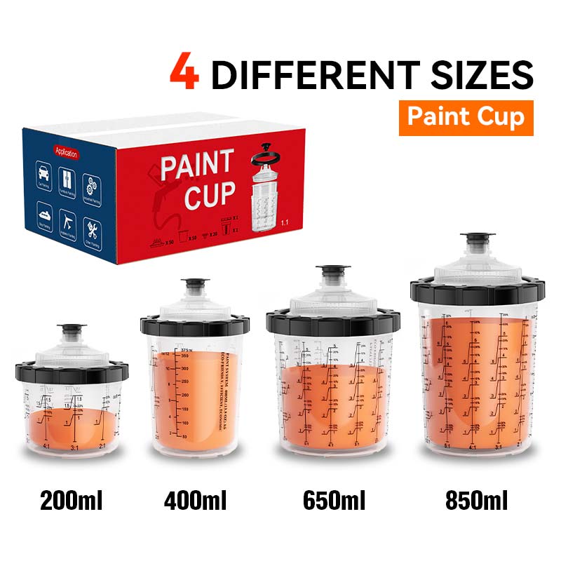 Основываясь на исследовании рынка, Paint Cup доступна в четырех спецификациях мощности: 200 мл, 400 мл, 650 мл и 850 мл, обслуживая различные сценарии использования, будь то для распыления крупной области или подробных подкрасок. Кроме того, внутренняя чашка была оптимизирована, чтобы обеспечить плавный поток краски, уменьшая засорение и отходы.